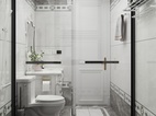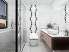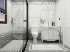 次卫采用了灰色系作为搭配,灰色的矮墙设计,预留出了大量的白色墙砖,让视觉更具美感。水刀腰线的设计手法,让卫生间档次得以升华。地面圆弧形简易水刀造型,与客餐厅吊顶相呼应。