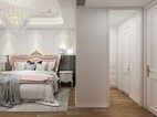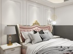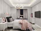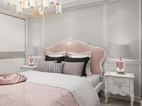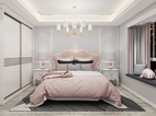 主卧的设计采用了不同寻常的拼色造型。粉色与灰色系打搭配。也能拼接出不一样的时尚感。圆弧吊顶以及石膏角花,床石膏背景,凸显出欧式的质感来。特别的吊灯设计。让空间充满艺术性。简单的木纹砖铺贴手法,也更加自然。