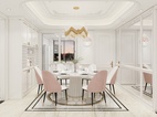 餐厅区地面采用了中间圆形水刀的设计,与餐桌相相呼应。同时吊顶,也与客厅区域一样。圆弧设计手法。餐厅的背景墙设置了镜子。主要是考虑到空间视觉问题。放了镜子有利于空间视野的开阔。同时也增加了光线的折射。