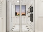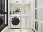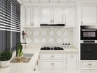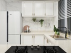 厨房间地面与墙面做了简单的双色拼铺贴法,让原本全白的柜体,凸显出不一样的视觉,也与客厅餐厅部分协调搭配。烘托出一个整体设计。
