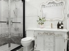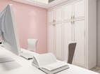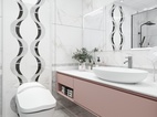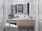 粉色系的柜体设计永远可以与灰白色系的墙面搭配在一起。马桶背景的水刀背景造型与其他墙面的搭配,让空间充满了豪华感。简单缺不失档次。