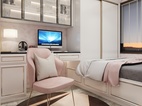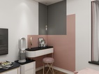 还是一样的粉色系搭配手法。卧室户型也是比较经典的。所以以简单的造型手法来处理,更显空间的宽大。灰色木纹砖与粉色系的也是那么的自然。