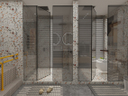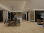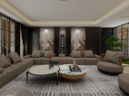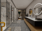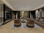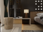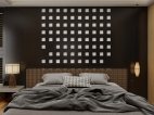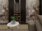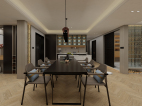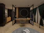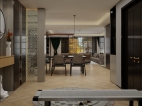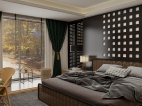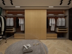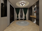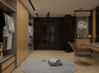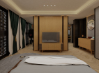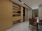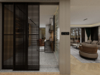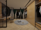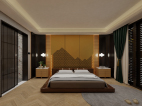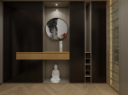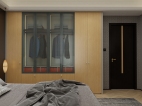 仪式感与实用性,此空间主要体现出圆弧实木墙板,在墙面也选用了一些精致的配饰作为装饰,床背景采用金属新中式艺术屏风,一分为二,一半作为主卧的衣帽间使用,一隅方寸间,“家”的明朗和煦已悄然发生