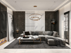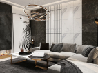 客厅墙面采用黑白大理石相互交替铺贴,凸显了客厅的现代高贵奢华感,与挂画斑马的纹理产生呼应,地面采用暖色瓷砖,使主人生处黑白灰的清淡世界不忘家的温暖