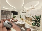 接待大厅是一进门吸引客户的重要区域,所以我结合轻奢的风格采用了金属质感作为整个空间的点缀色,从接待台到宣传文字LOGO再到沙发背景墙,甚至是装饰花艺外框都是运用到金色线条,凸显轻奢的特色。而在整体线条搭配上,吊顶不再沿用常规的造型,而是运用了圆,圆弧相结合的异型吊顶,搭配上灯带的内外映射,给人一种高级感。