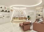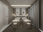 双人美容间以圆为基础元素,两个圆形灯带背景搭配圆形跳色涂料,使整个小空间拥有不一样的整体感,而错层吊顶加上地板线灯增加高级感。