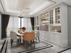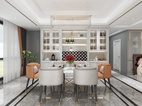 选用灰蓝色的极简欧式护墙板搭配白色石材背景墙、水波纹理石饰面来定义空间的清雅柔和,雅致的橙色与皮革轻轻地挑起空间的韵律美感,搭配花艺,空间附着着一层恰到好处、不过于浓郁的浪漫情调。阳光透散过微透的纱帘为空间染上一抹暖意,令人们不觉沉溺于韶华中的闲适与安缓。