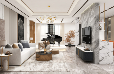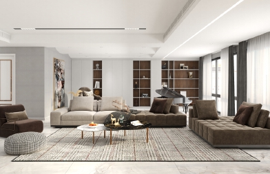 家具以高级灰的极简色调,与纤细的金属装饰灯搭配,呈现一种坚柔并存的特殊味道,编织出空灵朴拙的安静感与美,大面的窗户让室内变得特别的明亮、通透,在这里,古典和现代设计和谐地结合在一起。素色的地毯恰似林间泛起的晨雾,此时若窗外下起烟雨充满这朦胧的诗意和柔美,窗帘与地毯同样的色调运用使得空间变得特别的很和谐、舒适。楼梯的雕塑为整个空间带来了一丝沉稳的气息,墙壁简约干练的灰调空间,柔和、沉稳、安静,呈现宁静雅致的氛围,总能在不经意间触动人心,营造出富有灵魂的艺术境界追求更精致的生活态度,传递着一种神秘沉稳的姿态。