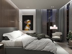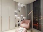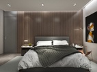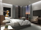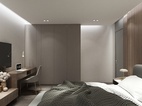 主卧空间色彩沉稳,隐藏灯带设计,运用光与影营造温馨与时尚氛围。床头灯具以高低错落的组合形式打破常规,提升层次。立体感极强的挂画,为主卧的视觉焦点,家具造型也更为凸显现代气息。