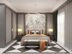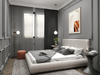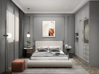 延续了客厅以灰色为主调的设计风格,白橙色简约的装饰画,复杂的欧式雕花线条,加上深灰色的窗帘,明亮的空间,卧室变得充满阳光、安静、舒适,可以让人有很好休息、睡眠