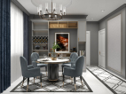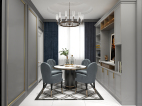在镜面般光滑奢美的餐桌、拥有神秘浪漫色彩的魅力蓝餐椅、格调十足的餐具和装饰画的映衬下,一股时尚的轻度奢华感,淡淡地弥漫