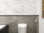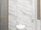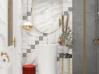 象牙白的浴室柜,橙色的花艺都是这冰冷空间中的一丝温暖