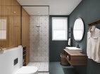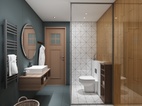 出于实用考虑,完美的实现了干湿分离,墙面采用木纹砖,几何线条的地砖给人通透的整洁感,干区则沿用了绿色,木色收纳柜也与绿色完美的契合。旁边放置了收纳篮等日常用品,处处体现了的生活气息。