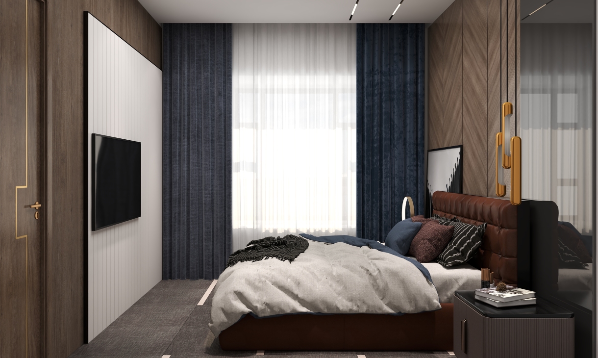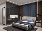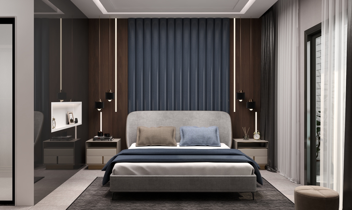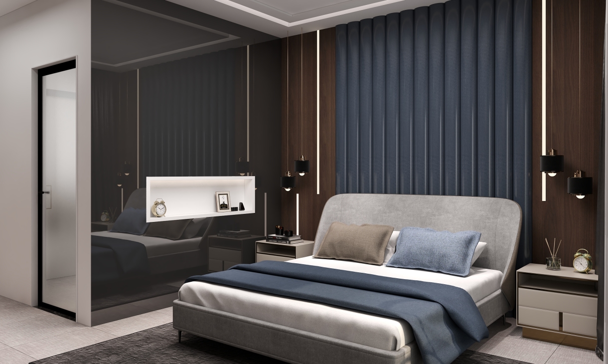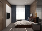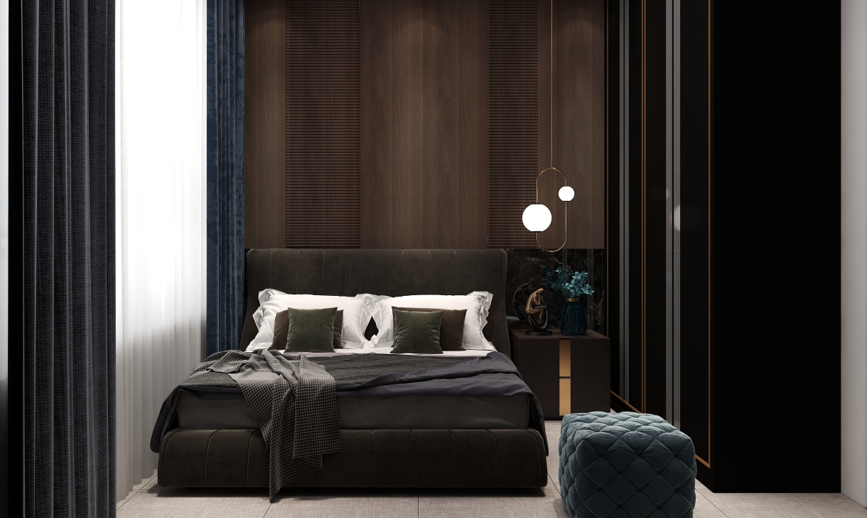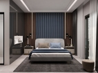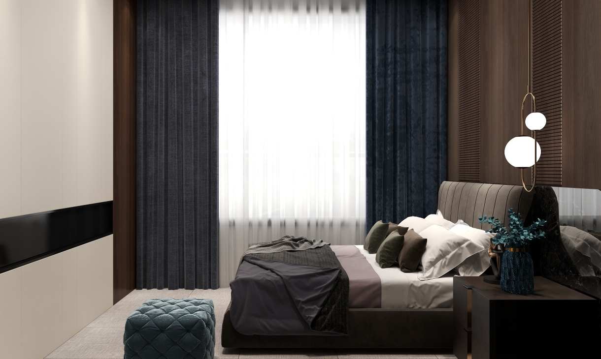 我们可以决定自己在什么样的空间里,醒来又沉醉 。利用不经意的蓝色与木色结合,以简单的形式出现,营造出简约、温馨的睡眠环境。