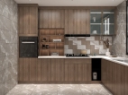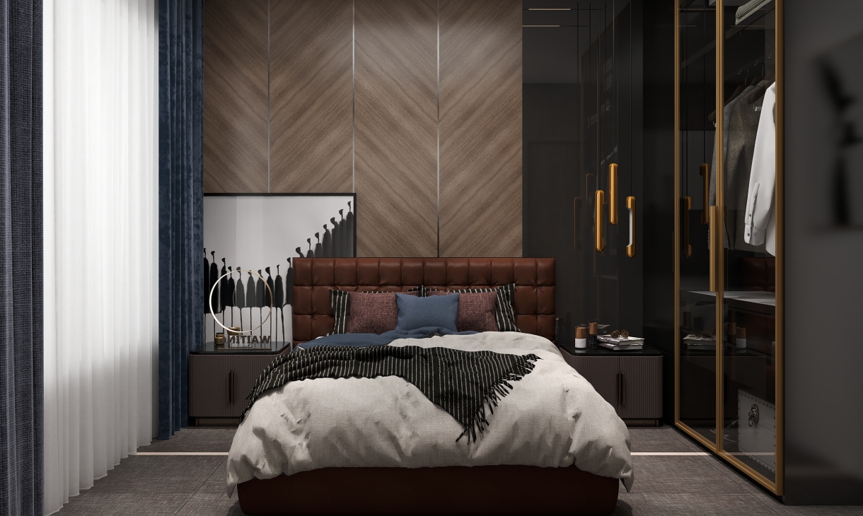 胡桃木色系的卧室,散发出相较于沉静的气韵,去除不必要的形式主义,回归物本身的质色、功能,以满足人的物质所需与精神满足。
