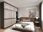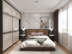 本案使用了灰色布艺床品和墙纸上点状浊色,让空间产生宁静氛围,又带有一丝自然的时尚感。墙纸肌理让深色空间不至于太过单调,特别里面也刚好有深灰色块,与卧室主题色彩作为呼应,带有花瓣的少女画像,画中色块呼应了壁纸和空间,让整个感官都得到平衡舒缓。