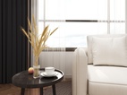 布艺的暖白色沙发,木色系的地板镶嵌在瓷砖中央,利用木的特性,在开阔的空间画上一个舒适圈,质感的碰撞,简练的营造着氛围感,一切都是如此简单,没有丝毫做作的遮掩,极致返璞的味道,斜斜逸出的一只木棉花、一束麦谷,都是细致生活的体现