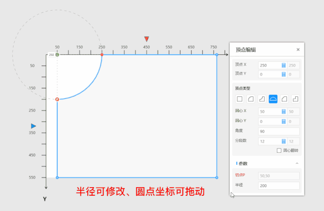 圆弧类型的顶点圆点可拖动、可修改半径值