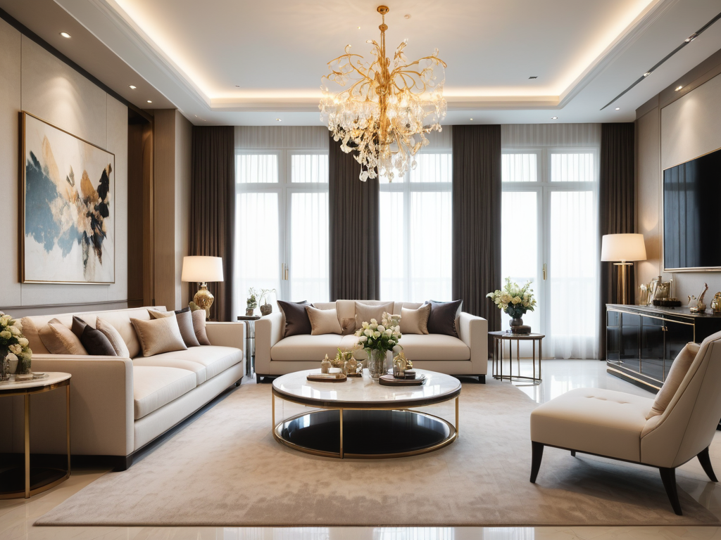 在选择复式客厅的家具时,建议选择功能性强且美观的家具。首先,沙发应当舒适且能够容纳足够的人员,推荐选择大尺寸的模块沙发,以便于根据需要调整布局。其次,茶几的选择可以考虑多功能的,既可作为咖啡桌也可提供储物空间。对于电视柜,建议选择简约设计,与整体风格相符合。此外,灯具也应与空间相协调,如使用吊灯与台灯的组合,增加空间的层次感。
