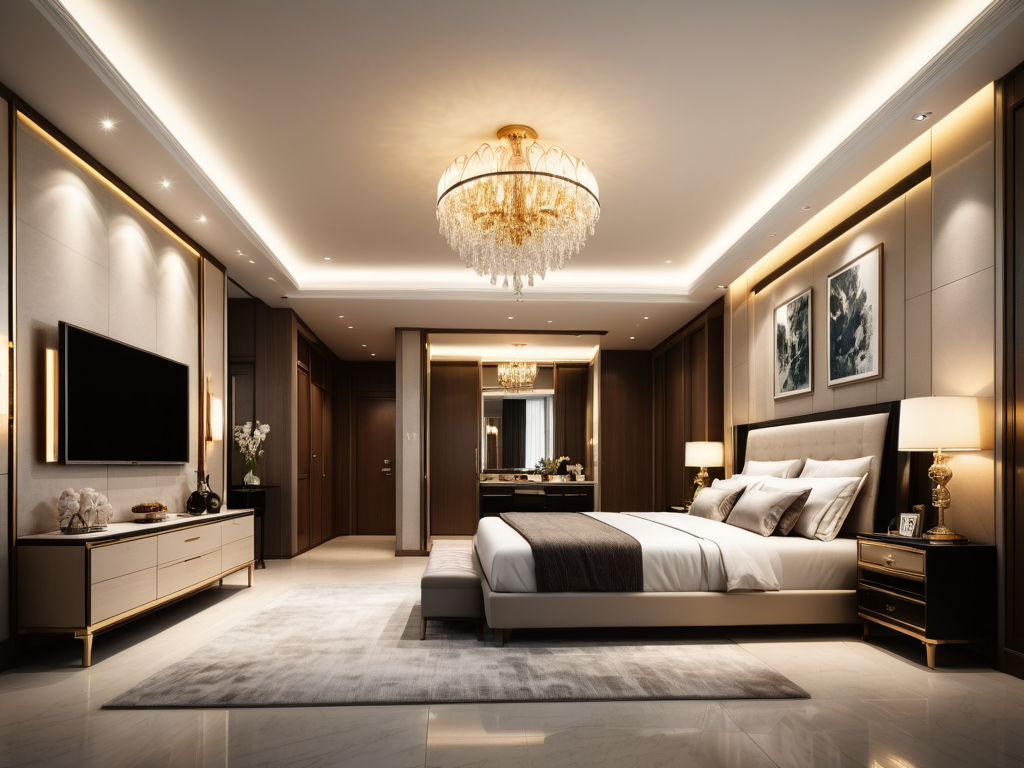 豪华别墅的室内照明设计应注重层次感和氛围营造。首先,使用主灯、辅灯和氛围灯相结合的方式,以达到不同区域的照明需求。其次,选择可调光的灯具,可以根据不同时间和情境调整光线强度。此外,灯具的造型和材质也要与室内设计风格相协调,避免出现突兀感。在重要区域如客厅和餐厅,可以考虑使用水晶吊灯或大型装饰灯,以增加视觉焦点。
