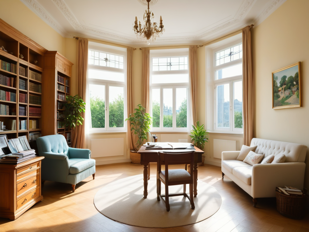 书房设计时,应考虑空间的光线、色彩、家具选择及电源配置等因素。首先,光线要充足,可以选择靠窗的位置,确保自然光洒入。色彩方面,温和的色调能帮助集中注意力。家具选择上,书桌要适合自己的工作习惯,而电源配置则要满足电子设备的使用需求。