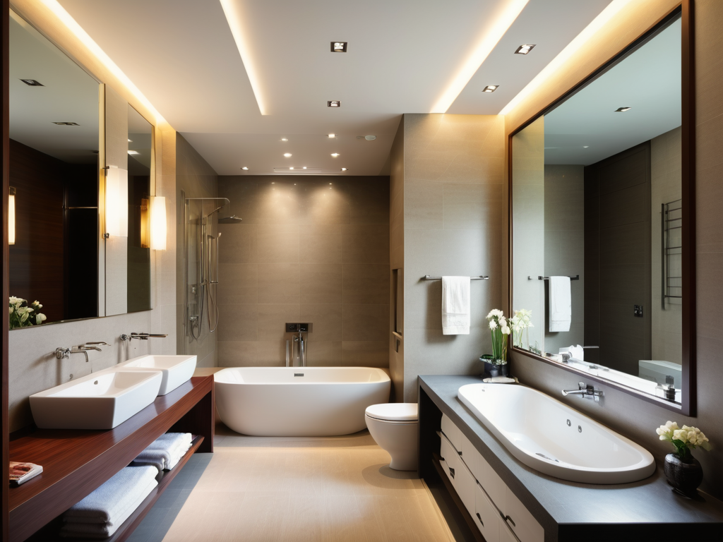 浴室灯光选择时,应考虑明亮且柔和的光线。可以选择LED灯具,既节能又亮度调节灵活。主灯和辅助灯的搭配使用可以避免阴影,保证照明均匀。对于镜子周围,可以安装壁灯或嵌入式灯具,以便进行美容、剃须等细致活动时提供更好的光照。