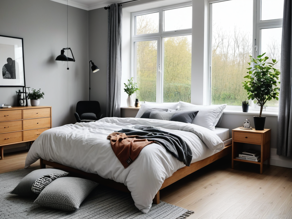 在家具摆放时,遵循一些基本原则可以使卧室更加舒适。首先,床应放置在卧室的中心位置,通常是对称于门的位置,这样可以在视觉上形成一种平衡感。床头柜应放在床的两侧,保持对称,增加空间的美感。衣柜可以放在卧室的一侧,避免阻挡窗户和门的开关。