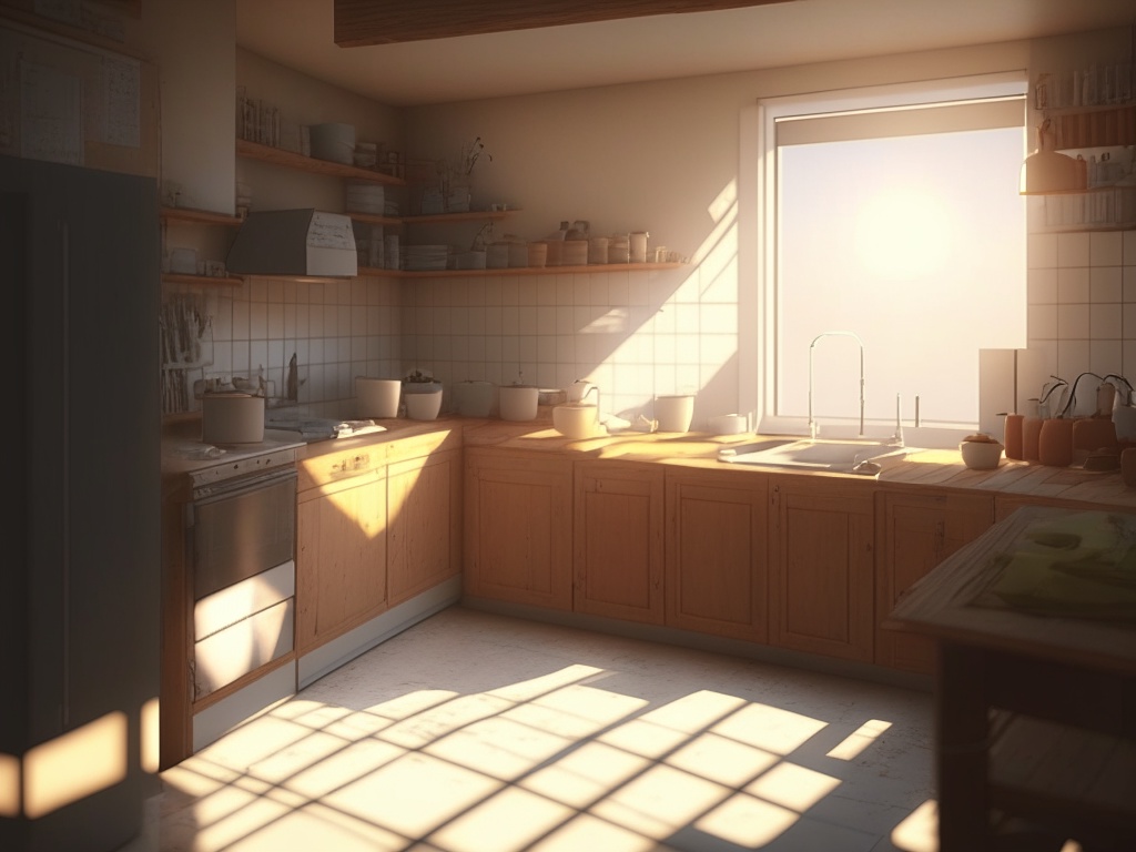 美式简约风格的厨房注重实用性和整洁感。通常采用简单的橱柜和台面,配以明亮的灯光和简洁的厨具。图片中的厨房采用了白色的橱柜和台面,搭配简约的灯具和厨具,营造出干净整洁的烹饪环境。