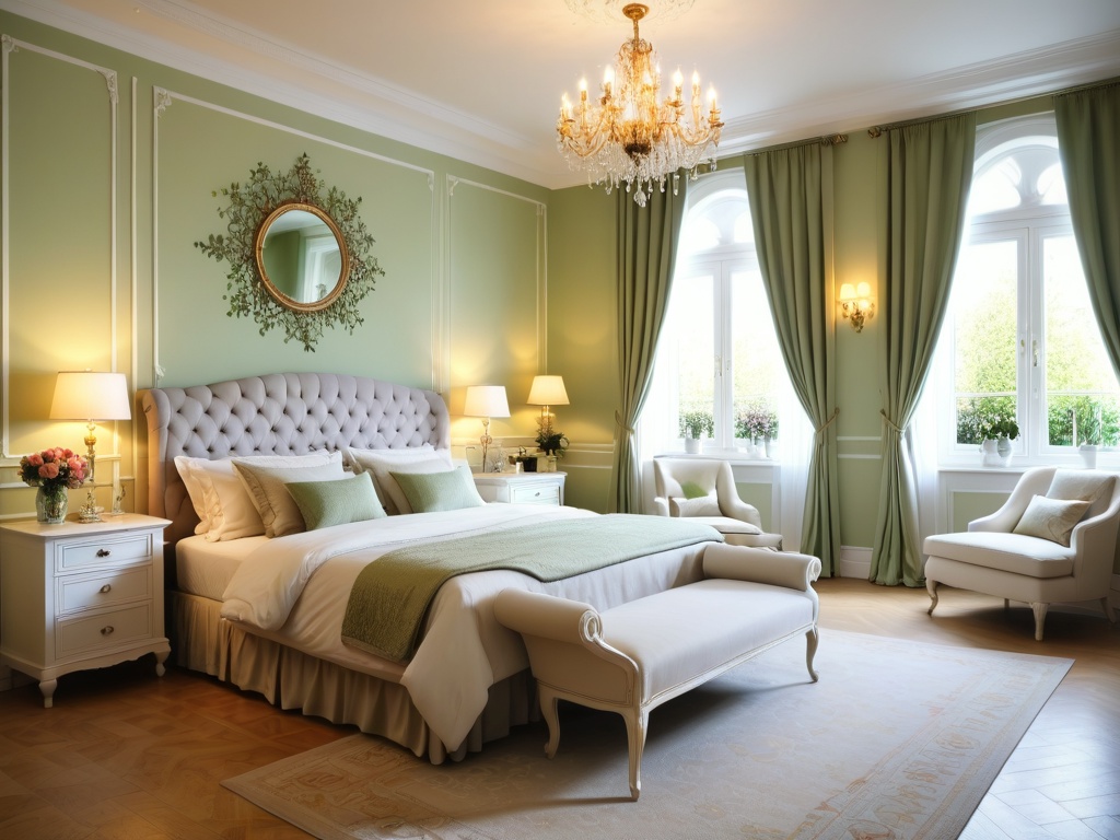 4. 照明设计:照明是营造房间氛围的重要因素。可以选择多个照明灯具,如吊灯、台灯、壁灯等,根据不同的功能区域进行布置,使整个房间光线均匀、明亮。