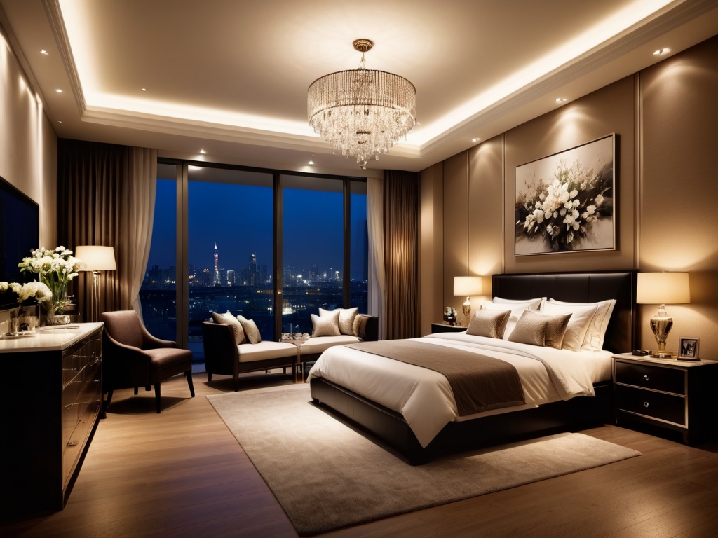 另外,在软装饰上,可以选择一些高质量的材质和面料,如真丝、绒面、羊毛等,以增加空间的质感。可以选择一些简约而精致的装饰品,如艺术画作、花瓶、摆件等,来提升空间的品味。