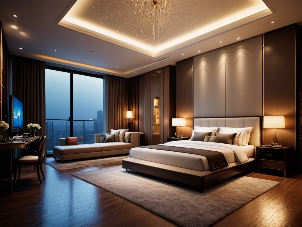 可以选择浅色调或白色系列的瓷砖作为卧室的装修材料,搭配柔和的灯光,选择舒适的床品和家具,营造出温馨舒适的卧室氛围。