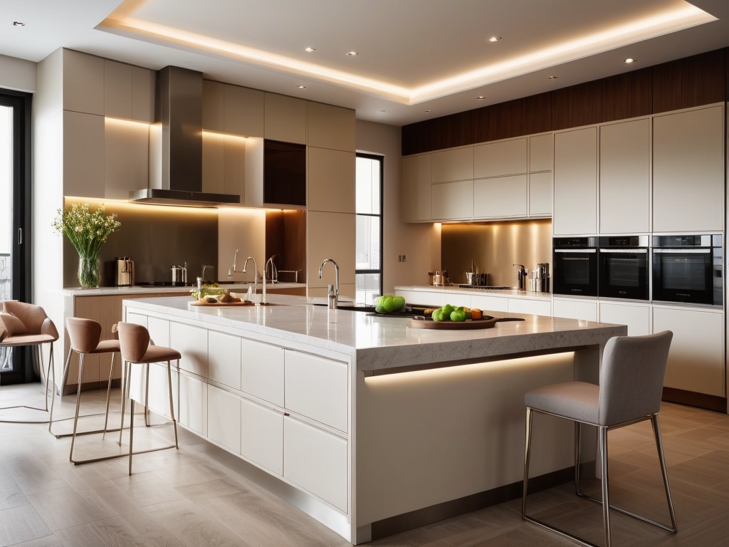 欧式风格的厨房矮柜注重细节和装饰,常见的特点是线条流畅、花纹繁复,使用大理石或仿大理石的台面,给人一种高贵、典雅的感觉。颜色上多以暖色调为主,如米黄色、咖啡色等,搭配金属拉手和把手,增加整体的豪华感。