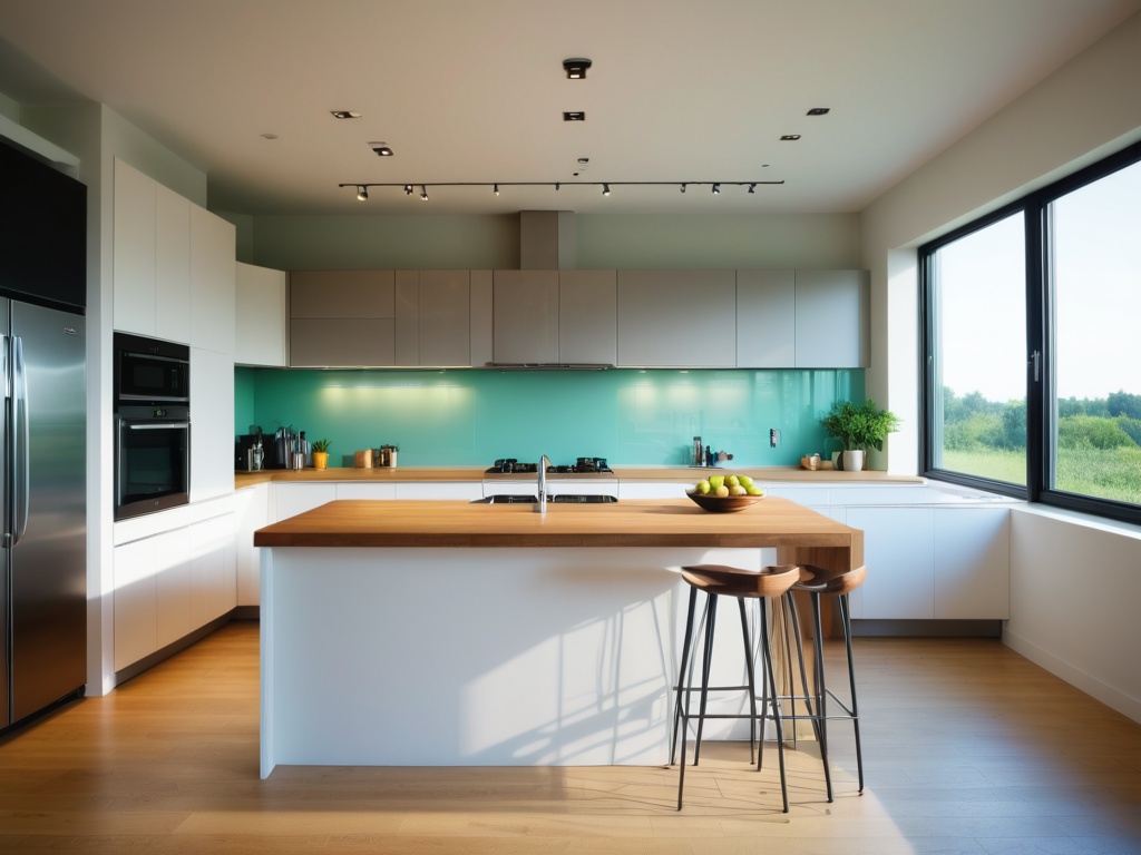 可以选择一些金属色的家具和饰品来与纯白色的厨房搭配,如不锈钢的厨具、银色的吊灯等,增加整体的层次感和亮点。