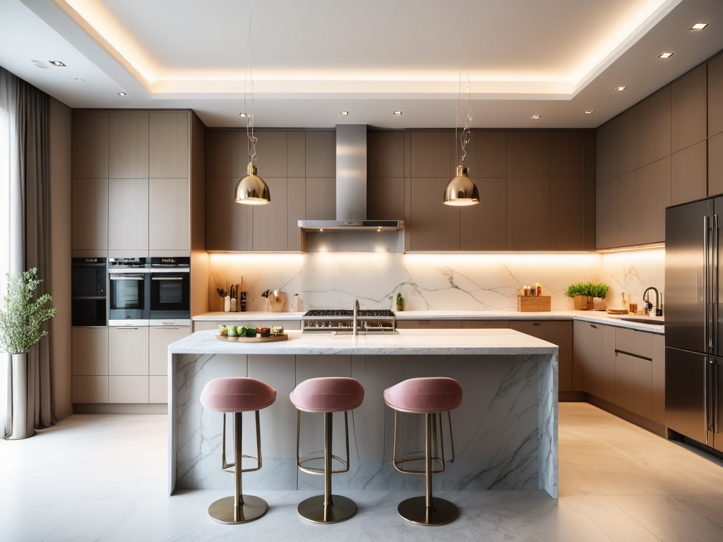 在大型厨房设计中,应合理规划工作流程,设置合适的操作台高度、工作台面积、烹饪设备布局等,使操作便捷高效,减少不必要的移动。