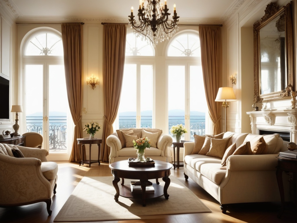 4. 大气磅礴:欧式装修追求宏伟、壮丽的效果,使用大型的吊灯、壁画、雕塑等元素,营造出一种庄重、宏大的氛围。