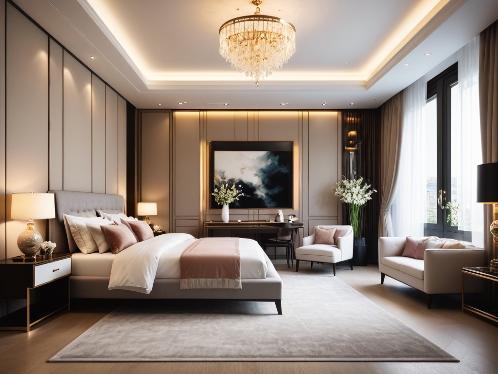现代轻奢风格注重简约和功能性,追求线条的简洁和空间的开阔。常见的装饰元素包括简约的吊灯、大面积的玻璃窗、金属质感的家具等。色彩上以中性色为主,搭配少量的金属色,营造出简约而高雅的氛围。