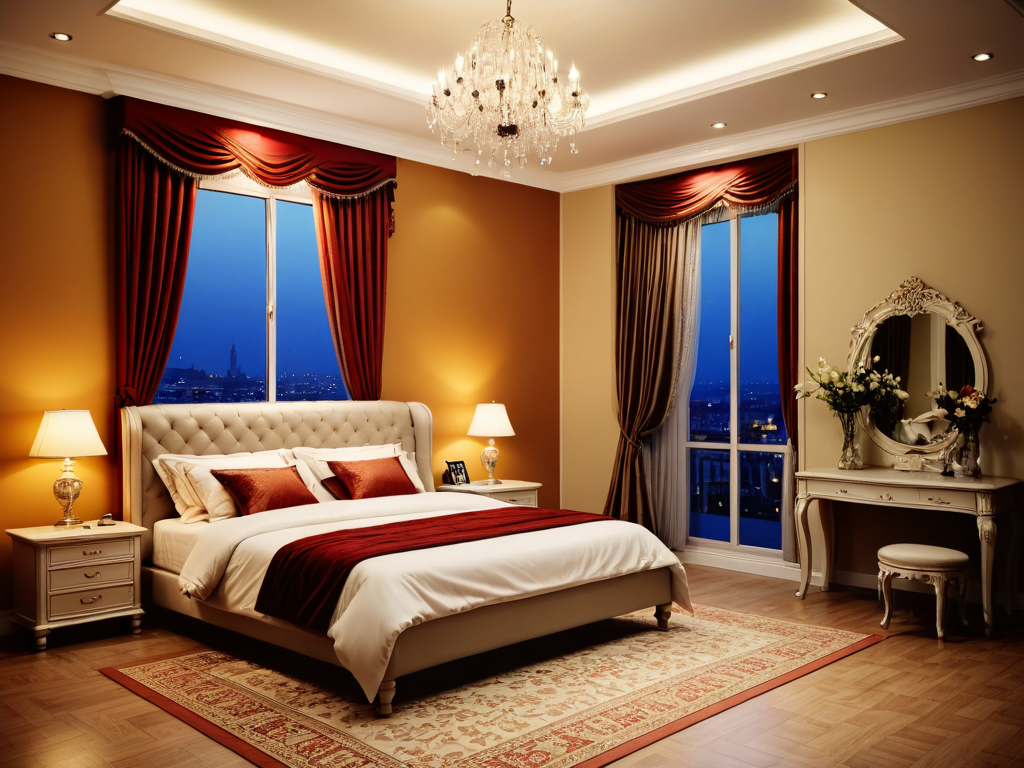 4. 软装饰品:通过合适的软装饰品可以增加卧室的美感和舒适度。如床上用品、窗帘、地毯等。可以选择与整体风格相符合的款式和材质,营造出温馨的氛围。