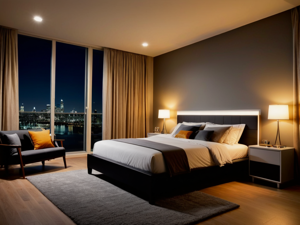 简约风格装修效果图现代的灯光设计要点有:选择简洁造型的灯具、采用暖色光源、注重光线的照明效果与柔和度等。