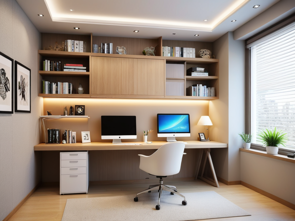 书柜和书架是简装书房装修效果图中常见的元素之一。它们的设计应该考虑到书籍的存放和展示需求。书柜和书架的大小和形状应该根据书籍的数量和大小进行选择,以便更好地存放和展示书籍。此外,书柜和书架的材质和颜色也应该与整体装修风格相协调,以营造出一个和谐的书房环境。