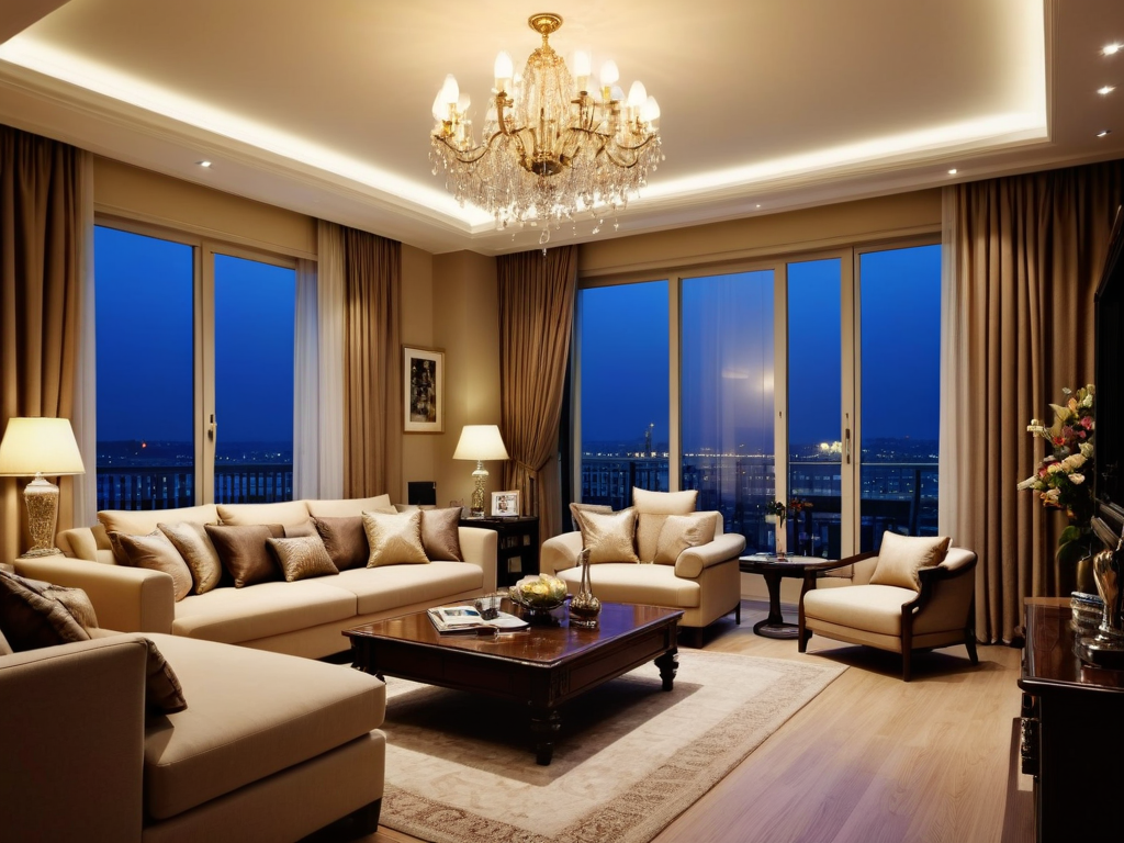 3. **灯具设计**:灯具在新中式客厅中也扮演着重要角色。可以选择一些具有中式风格的吊灯或台灯,灯光柔和,营造出温馨的氛围。