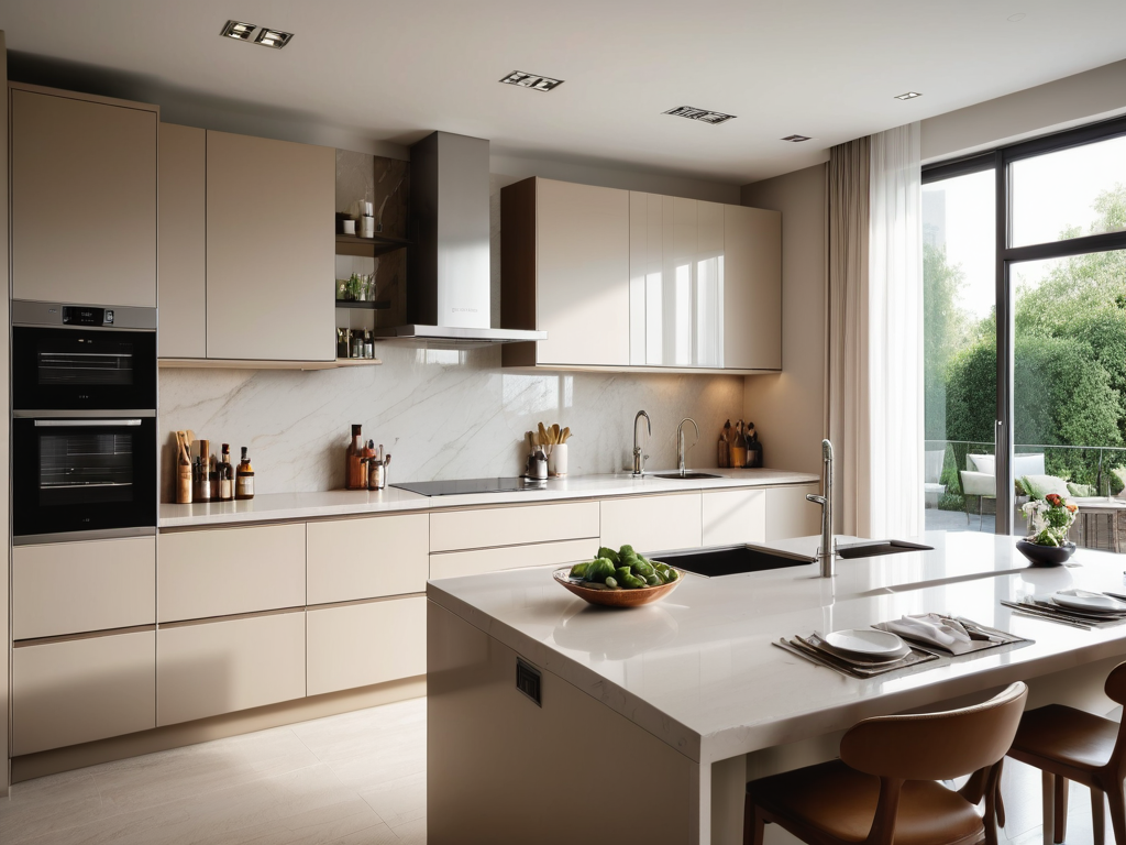 美式风格的厨房设计通常是开放式的,注重与餐厅的连通性,方便家庭聚餐和互动。使用大量木质材料,搭配大尺寸的橱柜和岛台,常见的有实木或者石材的台面,营造出温馨而实用的环境。此外,厨房的照明也很重要,常使用吊灯或射灯增加空间明亮感。