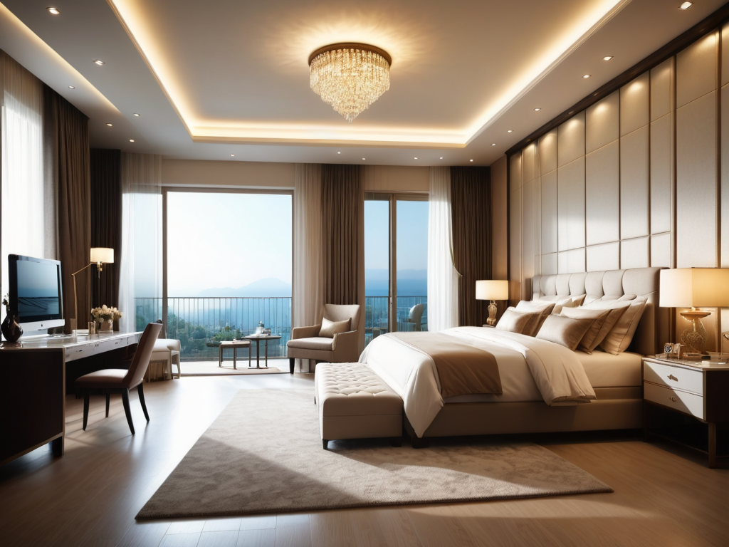 可以选择自然的中性色作为基础,如米色、灰色和温暖的棕色作为墙面颜色。然后通过软装,如窗帘、地毯和抱枕等,加入一些鲜艳的色彩,如深蓝色或红色,以提升空间的活力和层次感。