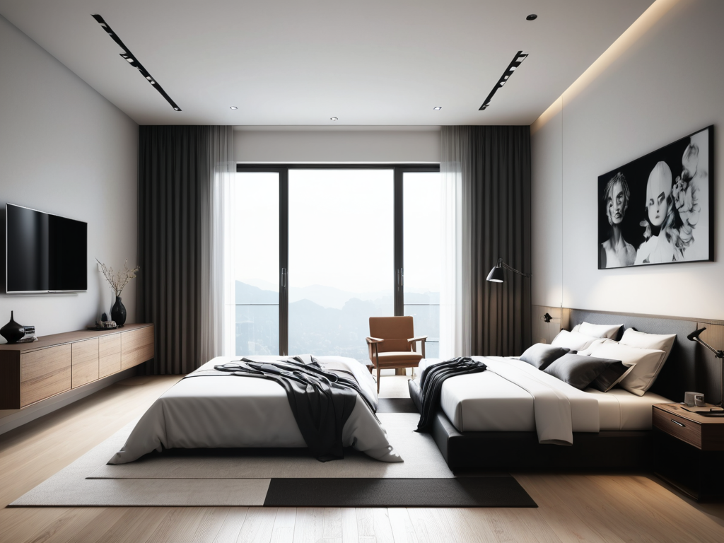 5. **软装搭配**:床品的选择也非常重要,建议选择高质量的床单、被套和枕头,颜色和图案要与整体风格相协调。地毯的使用可以增加卧室的舒适感,同时也能起到装饰作用。