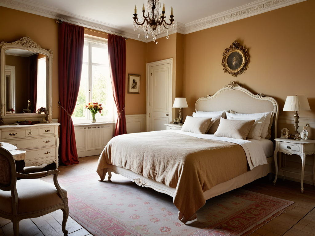 选择家具时应注重其设计感和用料,常见的有雕花的木质家具、皮质沙发和古典风格的餐桌椅。颜色上,深色调的家具与淡色墙面形成对比,常用的材质有实木、皮革和丝绸,尽量选择那些带有优雅曲线和繁复细节的设计。
