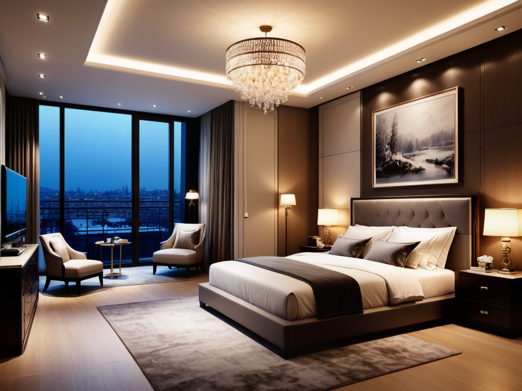 在照明方面,欧式田园风格卧室通常采用柔和的灯光。可以选择一些复古风格的吊灯或台灯,搭配暖色调的灯泡,营造出温馨的氛围。此外,窗户的设计也很重要,尽量选择大窗户,让自然光线充分进入,增强空间的通透感。