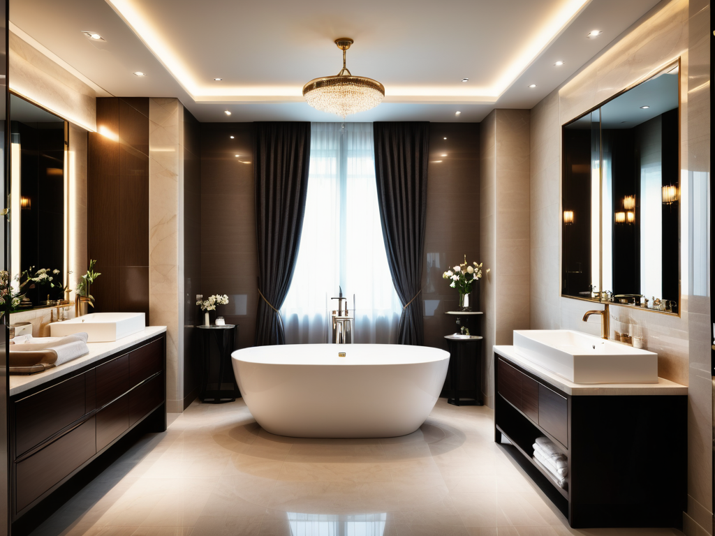 选择材料时要考虑防水、耐磨和易清洁等特性。通常,墙面可以选择防水瓷砖或涂料,地面建议使用防滑瓷砖,避免滑倒。浴室柜和其他家具应选择防潮的材料,如实木表面经过特殊处理的板材。此外,五金配件如水龙头、淋浴头要耐腐蚀,确保使用寿命。