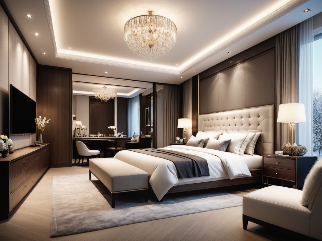 照明设计可以使用柔和的光源,避免强烈的直射灯光。可以选择落地灯或壁灯,这些灯具的设计应与整体风格相协调,建议使用金属或玻璃材质。通过调节灯光的亮度和色温,可以营造出温馨而又奢华的氛围。