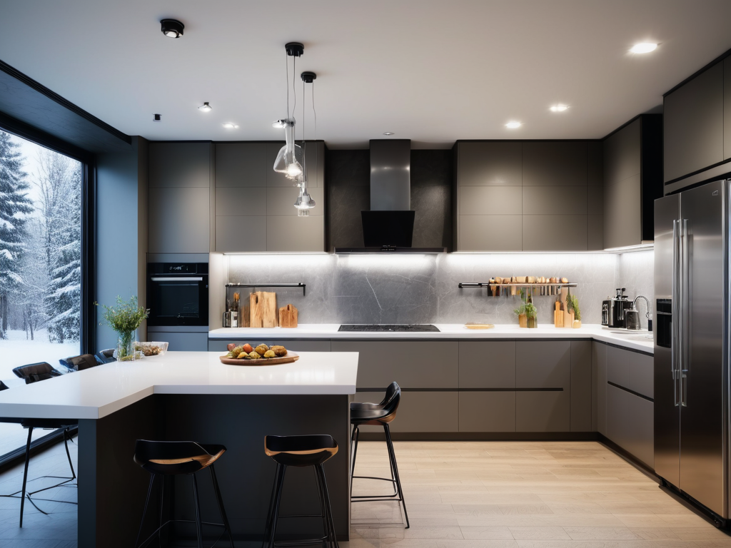 3. **厨房**:高级灰的橱柜与白色的台面搭配,既显得干净利落,又不失现代感。可以通过一些绿色植物来增添生机。