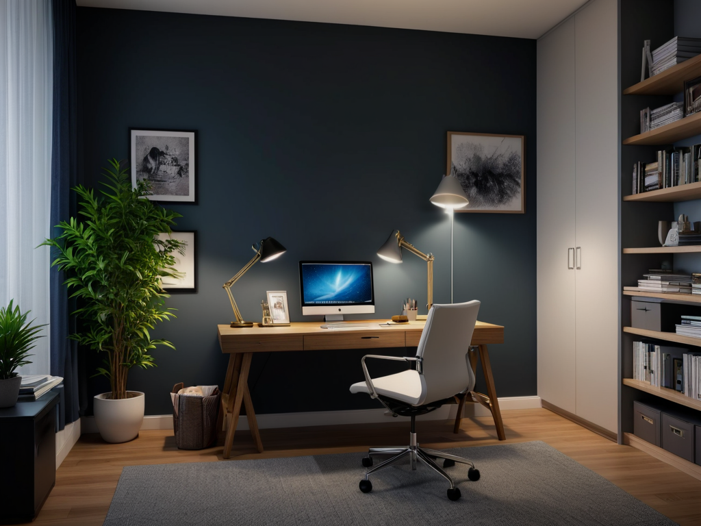 书房的照明应以明亮而不刺眼为主,最理想的是能够调节亮度的照明设备。桌面灯应选择可以调节光线角度和亮度的款式,避免直射眼睛的强光。主灯可以选择吊灯或吸顶灯,光源最好是暖色调的LED灯,能够营造温馨的氛围。此外,可以考虑在书房的某些角落设置一些柔和的间接照明,增加空间的层次感。