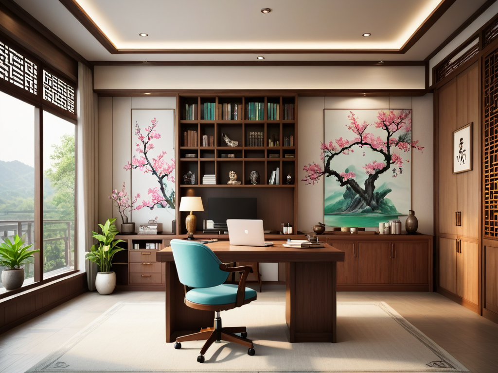 3. **墙面装饰**:墙面可以选择淡雅的壁纸或涂料,搭配一些自然风景的画作,增加书房的艺术氛围。